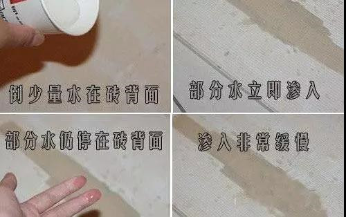 同样的一块瓷砖,用手掂起来重量大的是好砖,说明密度大,吸水率低。反之,重量轻的那块是劣质砖。把一杯水倒在瓷砖背面,扩散迅速的,表明吸水率高,在厨卫间使用就不太合适,因为厨房和卫生间常处于水环境中,必须用吸水率比较低的产品才行。