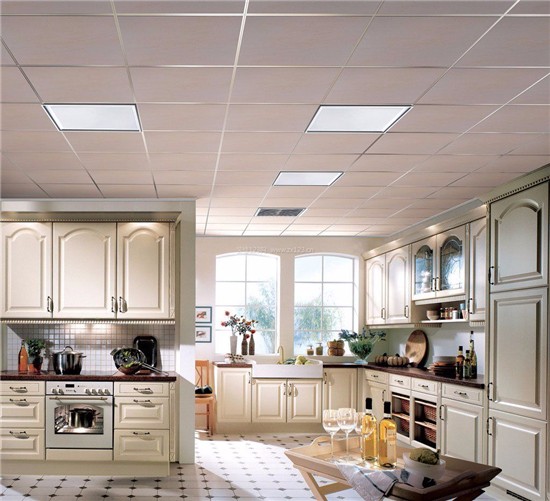 石膏板其实很少使用在厨房吊顶中,因为石膏板的核心成分是石膏,固防水性不好,在潮湿的环境中容易受潮变质。当然其装饰效果很好,延展性和造型能力强,价格也比较实惠。如果能够确保厨房干燥,那么还是可以使用石膏板吊顶的。目前市场普通石膏板的常用规格有1200*3000和1200*2440两种,厚度一般为9㎜。其特点是价格低价,但遇水遇潮容易软化或分解,厨房环境潮湿不建议使用。