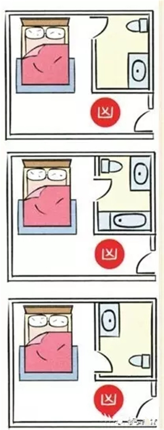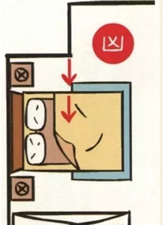 房间里的厕所对到床,情况比房门对到厕所严重,对到头,会头痛、思考时不能集中,住久了会产生肿瘤、中风等;对到腰,会腰酸、心脏无力、水肿,住久了会产生糖尿病、心脏病;对到脚,会坐骨酸痛、膝盖无力、痛风水肿,住久了会产生意外骨折。