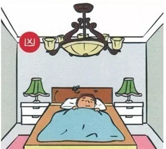 卧房的天花板,应简单为宜。千万别学商业空间,弄得非常艺术、奇特、花样百出,甚至装上镜子,这会使人不易入睡,久而久之健康会出问题。床位上方不可挂奇形怪状的灯具,会使人产生紧张不安的感觉。在地震频发的当今,床的正上方最好是完全没有任何灯具,卧室照明尽量使用床头桌灯或立灯及靠近墙边的隐藏灯管。
