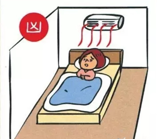 床位安置在空调下方,寒气不断吹向头、肩、颈,加上人在睡眠状态时,毛细孔会略微放开,轻者经常感冒,重者会造成头、肩、颈的神经紧张、肌肉僵化。