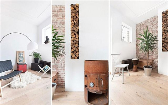 都说细节决定成败,在装修这件事情上,我相信细节更可以展示出人的性格。看看这组细节图,简约的弧形立灯和斯堪的纳维亚风格的毛毯相得益彰。锈迹斑驳的铁壁炉和嵌入墙壁的柴草,完美的相融在一起。原木色的地板配上红色裸露的墙砖,流露出原始气息,不做作的真情实感。不经意间搭配的小绿植更是增添生气。