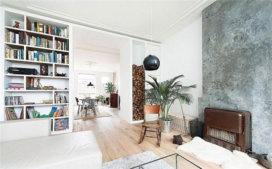 客厅的可讲之处还是蛮多的,看看这个书架,直通房顶,可以看出主人是多么热爱读书。远处由柴草堆成的糟心,给人留下深刻的印象。一大颗绿植的摆放,让空间多了一分活力。周围的布景以白色的现代装饰为主,结合一些中性的色调,营造出了一个宁静舒适的环境。