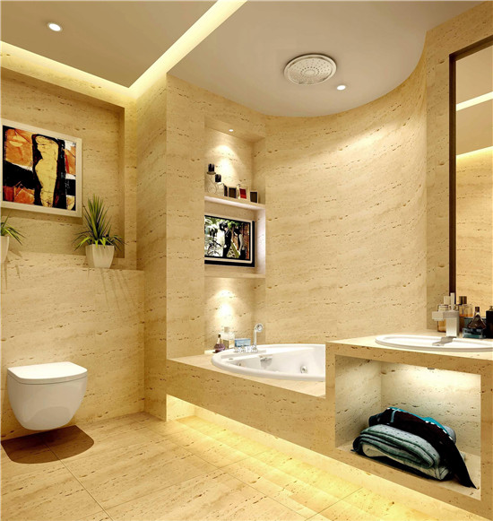 6、卫生间常常会被水蒸气围住,因此在卫生间装修时要考虑好顶部的防潮问题,最佳选用防水功用较好的PVC扣板。这种扣板能够装置在龙骨上,还能起到遮掩管道的效果。