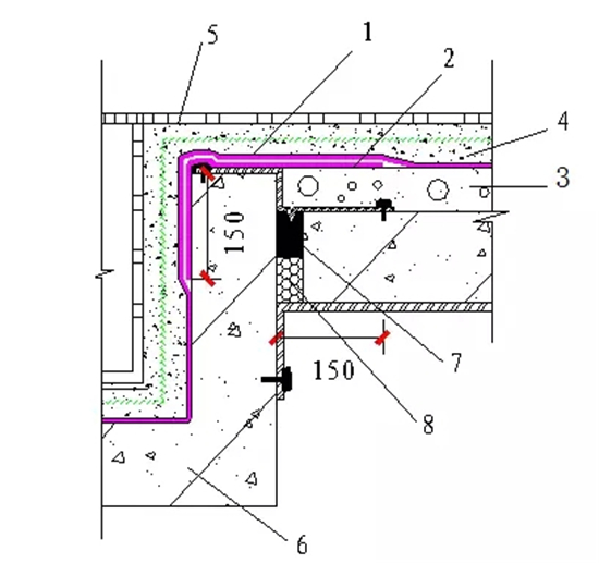 1—聚氨酯防水涂料(用量≤2.4kg/㎡);2—聚氨酯防水涂料附加层;3—填充层;4—刚性保护层(内衬钢板网);5—面砖层;6—钢筋混凝土结构层;7—密封材料密封;8—背衬材料