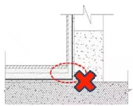 图1中左边的图展示的是使用砌块砖砌筑的墙体,砌块砖直接落地。这种做法不可取,容易导致后期防水涂膜开裂,引发渗漏。标准的做法是:墙体根部用钢筋细石混凝土浇筑导墙(图1下)。