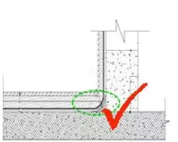 在对卫生间的墙根处进行防水处理前,要先用1∶2水泥砂浆抹成半径为50mm的R型圆角,在R型圆角上加铺200mm宽的网格布或无纺布(图9)。这样做,是因为墙根处容易伸缩变形,容易开裂,做R型圆角后则会缓解这种现象的发生。所以,不宜在墙根直接涂刷防水涂料,否则后期易出现积水渗漏。