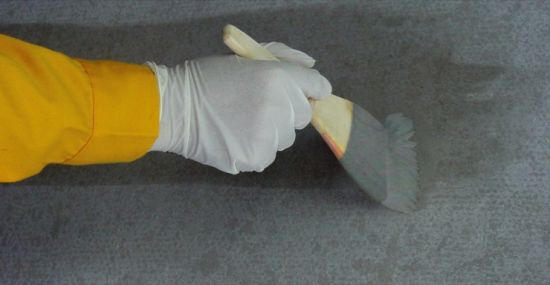1)喷涂聚脲涂料是喷涂成型,当物料从枪口进行 A、B 组分混合喷到基面上时,涂料已开始发生了快速的接链化学反应,化学反应的结果使物料粘度有了很大增长。它与普通刮涂型涂料不同,刮涂型涂料涂覆到基面后,仍是流动状态,与基面具有很好的浸润性,这种很好的浸润性能提高膜层与基面的粘结能力;聚脲喷涂型涂料一旦从枪口喷出,对基层基本无浸润性。在不做基面处理,未考虑喷涂层与基面衔接的情况下,随着喷涂涂层强度的增长,同时还伴随着涂层的体积收缩而产生的应力,就会很容易破坏掉涂层与基面间的微弱粘结,造成涂层起鼓。所以喷涂快速固化型的涂料,必须要做有效的基底处理衔接层,才能保证涂层与基面的牢固粘结。我国即将颁布的有关喷涂聚脲的施工规程,对基面处理层作了明确的规定。此工程中涂层起鼓脱离现象的出现,就是没有做基面处理的印证。