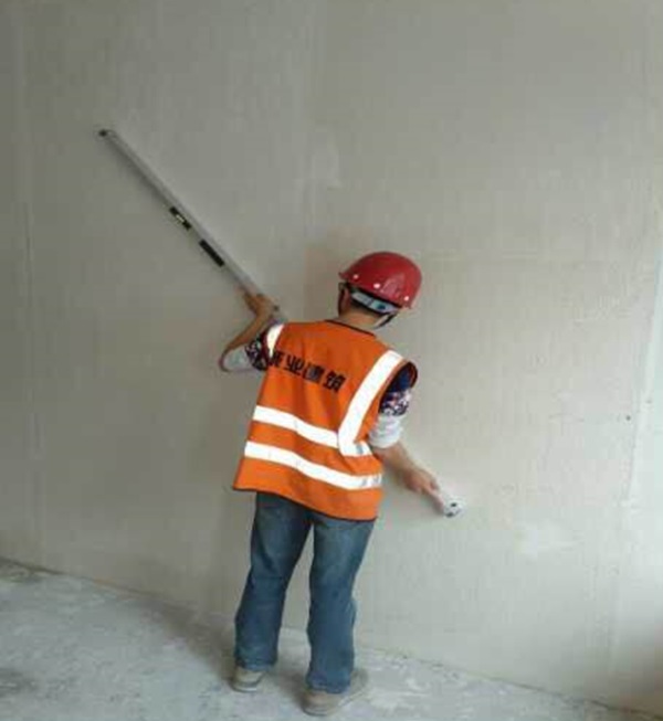 用喷涂机或人工将石膏喷涂或人工批嵌上料。当上料人上料到一面墙的后一半时,找平的人应该直接开始用H刮板横向或者纵向运动进行找平。通过水平尺进行垂直度和平整度检查,细微不平整靠后期精细找平来弥补。