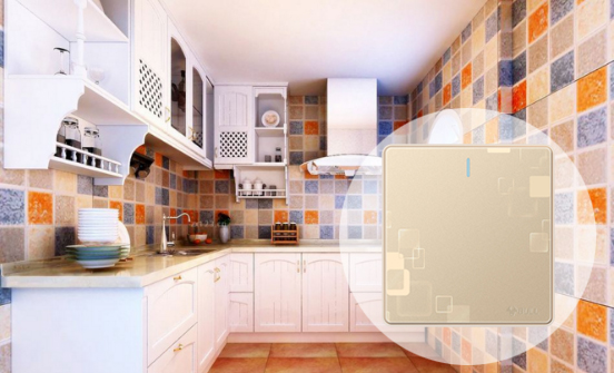 2、大面积的墙面马赛克要搭配起来其实并不容易,比较省心的设计方案就是安装白色或者是木色的吊柜作厨房收纳。上面提到的开关,在这里也要予以重视,否则就会像马赛克里的一块补丁,十分难看。公牛G18幻影纹理开关的无边框金色大面板,可以很自然的“嵌入”到马赛克当中,不影响整体的美观;同时其表面光滑如镜,不易积污垢,也容易擦洗,这对于要打造一个清爽质感的厨房再合适不过。