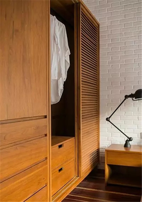 白色砖墙,兼具质感和取光需要,柚木定制衣柜,柜子没有做到顶墙的高度,就秀气灵活了一些。