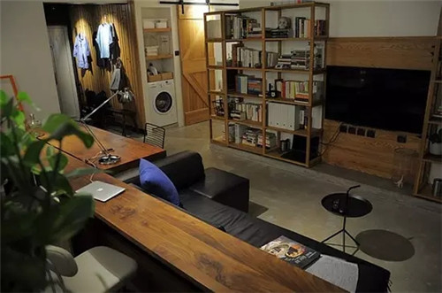 用定制的书桌打造了沙发和书房的二合一完美设计,同时,这还是个超棒的隔断!!