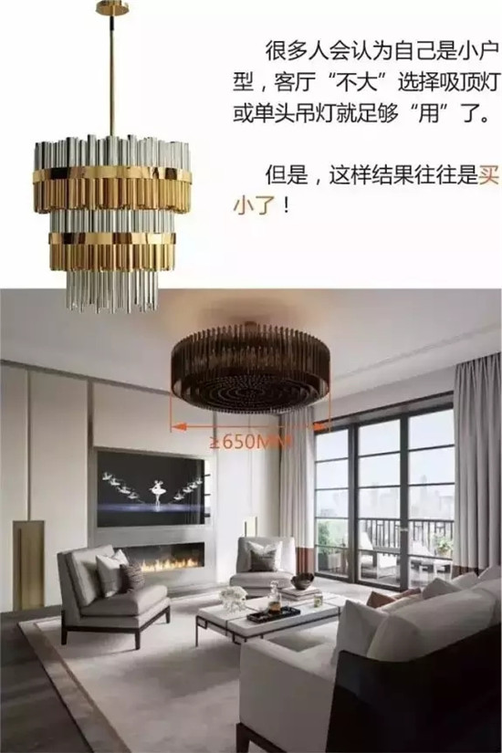 只要你家客厅不是小于10时,就放心大胆的买精 美的吊灯吧!吊灯的尺寸应不小于650mm ,通常现 在公寓房,客厅吊灯在750mm左右最为合适。