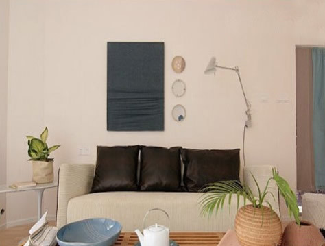 看到这个房间是统一用米黄色来装饰,让这个房间充满了舒适和宁静。阳光洒进房间里和房间融为一体。沙发没有沙发脚,现代式的榻榻米设计,增加了温馨的靠枕显得更加舒适,唯一装饰房间的就是一个画框和一盆植物,让房间有细节的设计感。