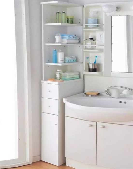 对于家里人口多,杂物多的业主来说,可以考虑在浴室柜的一侧或者两侧增加立柜来储物。可以放置毛巾、洗浴用品。
