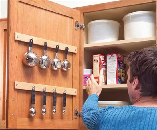也可以把橱柜门这个小空间利用起来。在上边固定几个粘钩,锅盖可以有序地组织到门后。