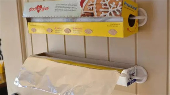除了竖着挂东西以外,挂钩其实也可以横着用。比如像图中这样,用两个横向挂钩架起盒装塑料袋等等,把买收纳架的钱都省了下来。