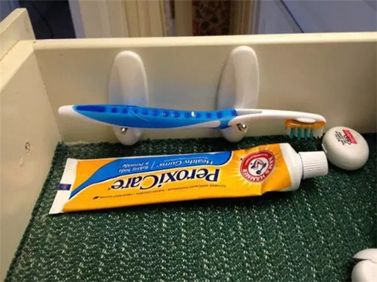 可以在抽屉内部粘上两个偏小的挂钩,像牙刷这种形状的杂物都可以陈在上边。比起所有的零碎物件都堆积在抽屉底部,这样会更加整齐清晰。