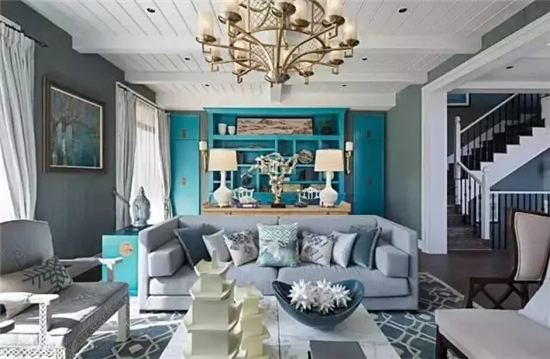 美式风格中,沙发背景墙设计手法更加多样,加以少量装饰线条与挂画,瞬间提气。