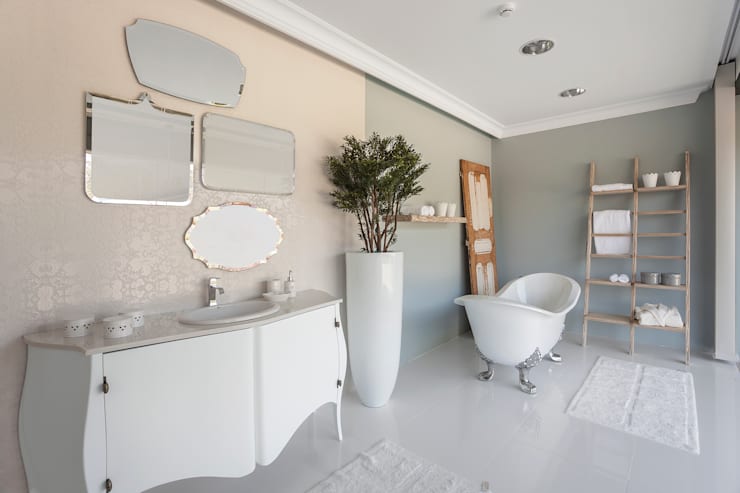 你可以选择像图片一样,贴上不同形状的镜子,利用反射的效果让浴室看起来更为宽敞。但是请注意,不要让镜面面向彼此,避免吊诡的反射情形产生。