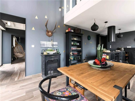 开放式厨房与餐厅, 颜色由深到浅,很好的过渡, 空间上和谐一体。