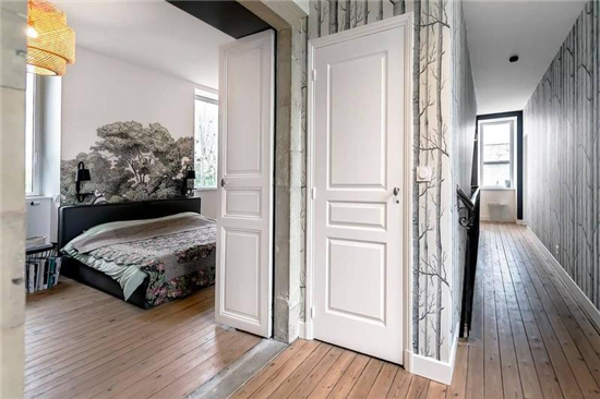 二楼走廊壁纸和木地板搭配出舒适的自然感。