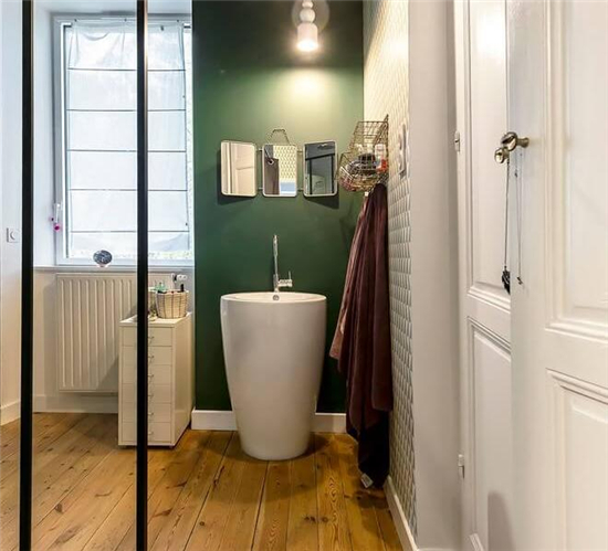 绿色墙壁,与独特的浴室物品,精致浪漫中又凸显出家主的小个性。