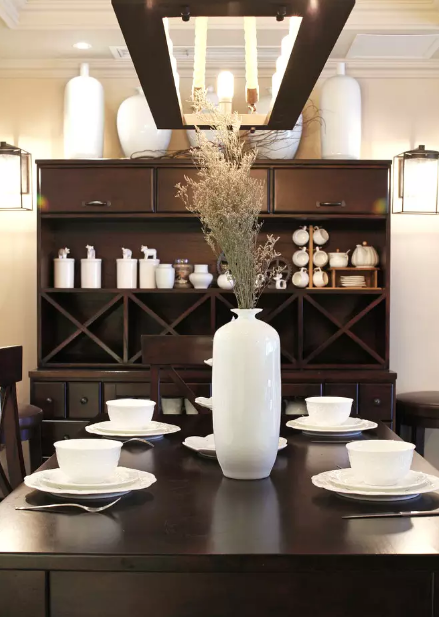 餐桌尺寸和吊顶宽度呼应,简单的线条勾勒出随性美式风格。餐桌正对的靠墙收纳柜恰到好处的成了展示架。