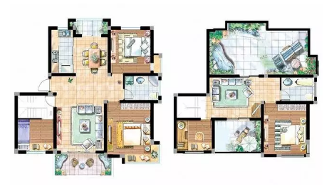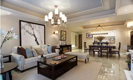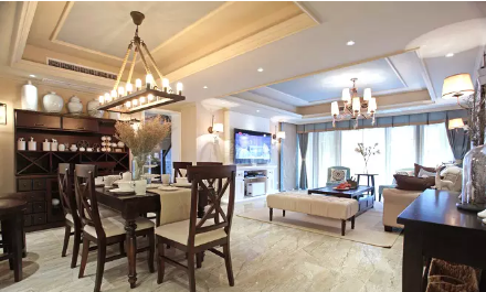 客餐厅均采用美式双层吊顶。这种风格给人建明、开敞、舒适的感觉。
