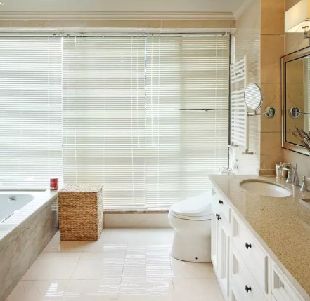 很多人喜欢把卫生间弄得密不透风生怕一个小窗泄了私密,但这里却十分敞亮 所以外墙封了后只用了一层百叶窗遮挡光线。显得宽敞且放松 很有情调。