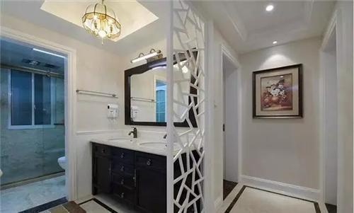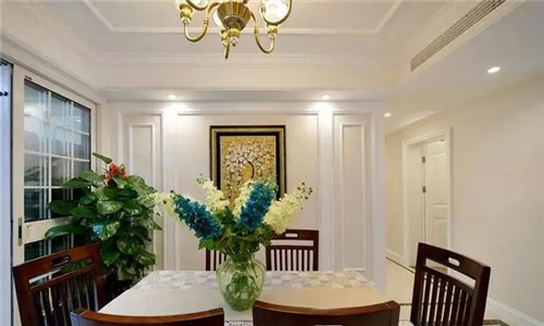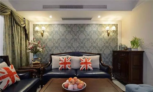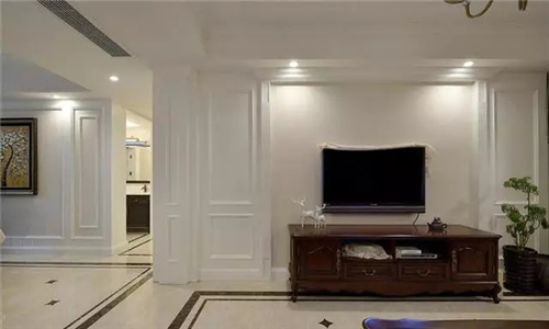 客厅,简单的美式装潢,吊顶线条明朗,电视墙和沙发墙用装饰条来打造层次感。