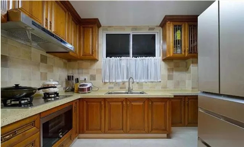 餐厅过来就是厨房,厨房面积挺大,装了木制橱柜,看着挺舒服的