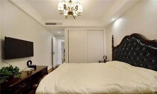 主卧,墙面和收纳柜是白色,大床深色,层次更鲜明。