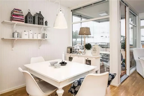 墙壁用分布比较密集的条纹墙纸进行装修,上面还安置了两排置物架,很好地赶走了墙面的单调感。