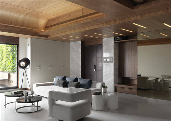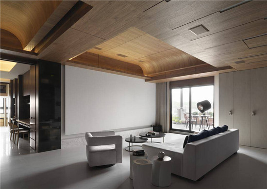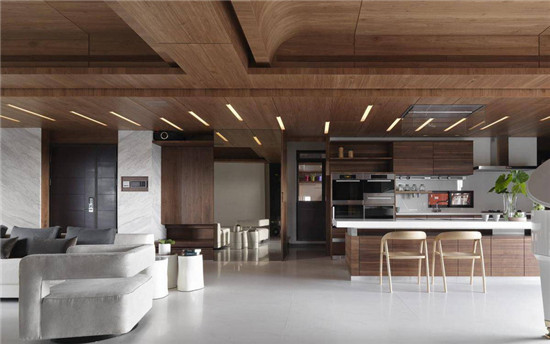考量洒水头过低以及错综复杂的管线布局,以弧度造型带入屋主钟爱的木皮元素,巧妙修饰过于压迫的屋高尺度。