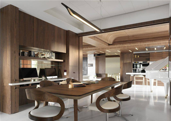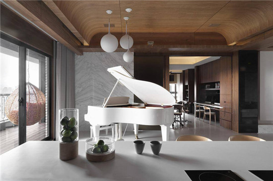 “极致繁复的工程细节,淬炼出品味出众的质感内涵。”源自于屋主丰富的生活经验,以及充满想像力的创意思维,设计师逐一归纳起居生活的机能逻辑,以人为本的风格主导,强调着交流分享的重要性。开放弹性的格局规划,以无落差地坪串接起绝佳尺度的空间关系。 以弧度造型带入屋主钟爱的木质元素,巧妙修饰了错综复杂的管线布局,与吊隐式冷气机的视觉尴尬。量身订制的爱犬小窝、客用卫浴狗狗的专用通道,以及鞋柜上的狗头把手巧思,再再可见一家人对于宠物的呵护与重视。