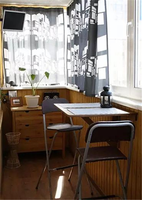 小编的话:木质墙面与木质家具相辅相成,在墙面上装上一个可折叠桌面,便可以利用这一小小的桌面设计在这边喝喝茶亦或是吃个早餐,瞬间就让这间阳台具有了实用性。