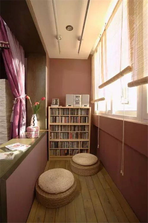小编的话:这间阳台则在空间内放下了一个木质书架,可以收纳下不少平日爱看的书籍,在木质地板上随意的摆放上两个藤编小圆座,这间阳台就可以当作一个小小的阅读空间来使用,而一旁的隔断也是相当能体现出实用性的。