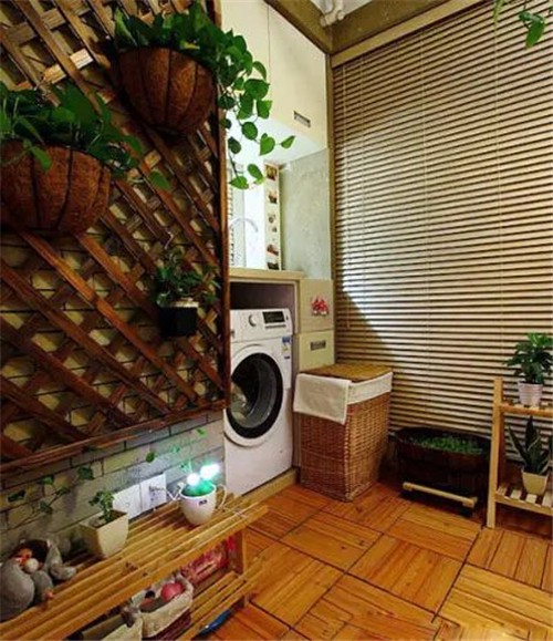 小编的话:以木质与砖墙结合,这个阳台空间中还专门为滚筒洗衣机留了一个位置,便于平日里在这边清洗衣物,小巧简单,空间中加以绿植的点缀,这样的一间阳台空间应该算是比较大众化的,却很实用。