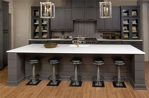 编辑点评:灰色的整体橱柜和吊柜设计打造了一个功能齐全、收纳功能强大的厨房,白色大理石台面与灰色木质感橱柜和谐过渡,方便清理的同时也弱化了灰色带来的沉重质感。