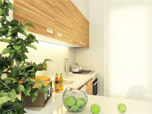 编辑点评:内嵌式炉具设计,节省空间,增加操作面积,而原木色的橱柜与盆栽相融合,增添空间的和谐美,凸显原始自然风味。