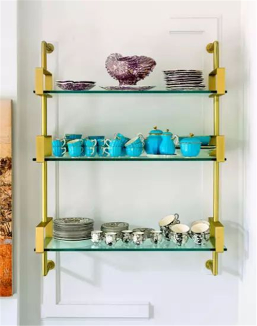 编辑点评:玻璃与铁架组合而成的储物架充满质感,美化了厨房角落也为瓷器提供了收纳空间。背景墙对角的凸出的L型使墙壁充满立体感。