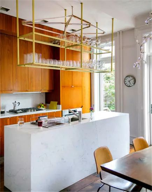 编辑点评:白色的大理石吧台隔断了餐厅与厨房,两层的黄色吊架用于易碎餐具的存放,方便、安全又美观。