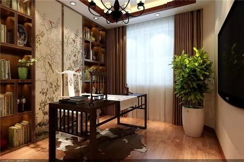 书房的书桌后方是一幅画,两侧是入墙式的书架,能感受到很大气的中式风;