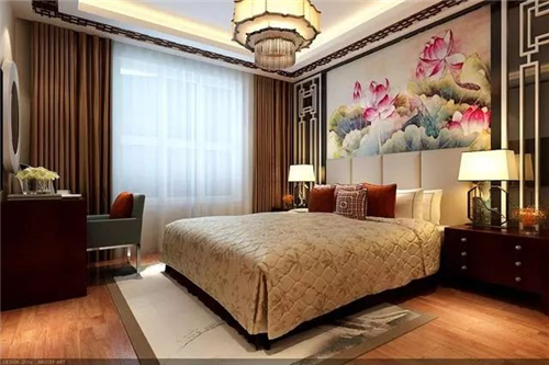 卧室的床头背景以荷花装饰,整个空间都充满中式的稳重感,连地毯都有中式的感觉;