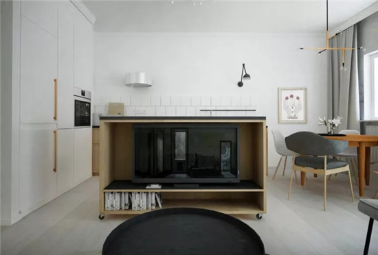 ▲客厅、厨房、餐厅以开放式的布局进行设置,沙发贴边摆放,中央区域可移动的柜体自由灵活,并且兼顾了多种使用需求,是内嵌的电视机柜,是划分客厅与厨房的隔断,同时也作为中岛吧台使用。