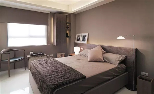 ▲咖啡色墙纸和床品成一体,让卧室显得、简约。窗户旁的暖气片上铺一块同色调桌布,得闲时候在窗旁喝茶、看书也是件很惬意的事情。