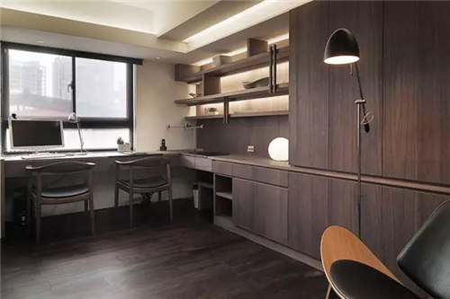 ▲同色调的木制的地板和书柜,让书房看起来整洁、干净又自然。