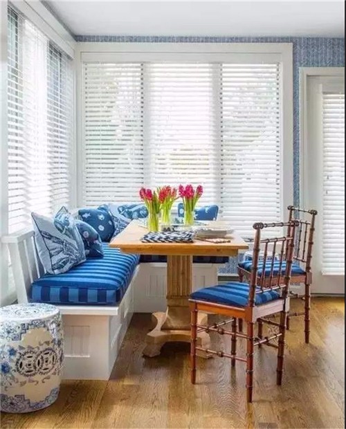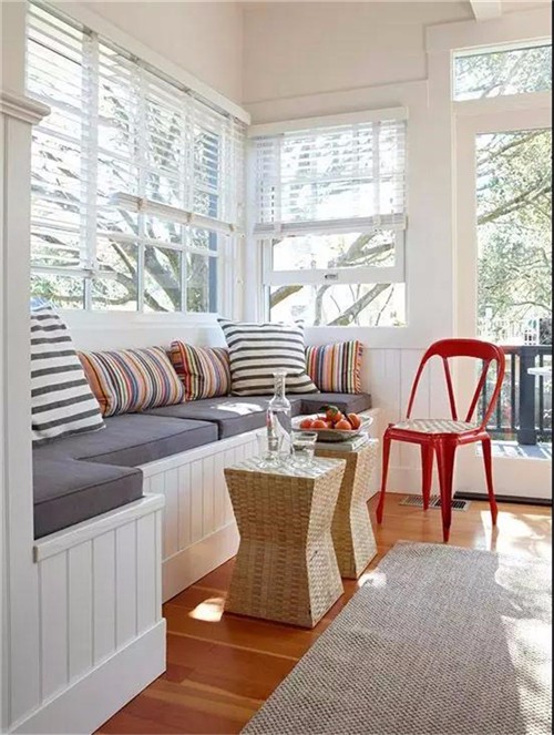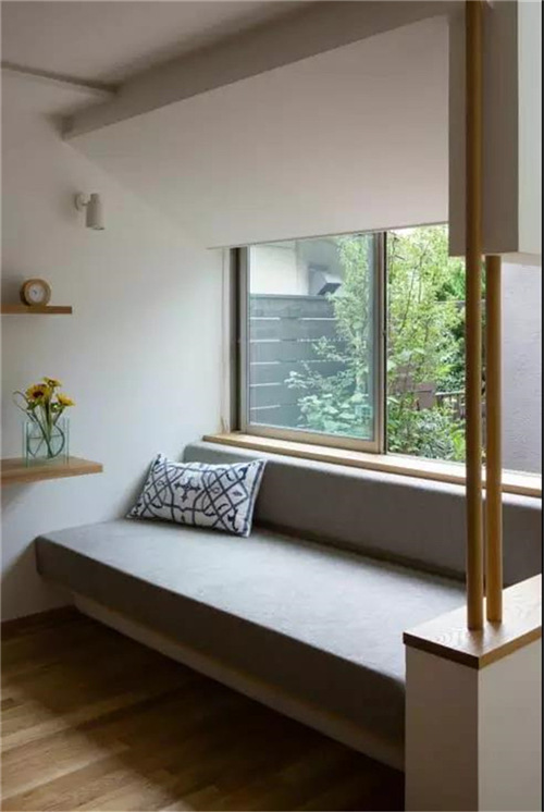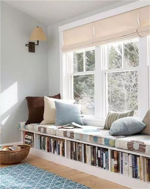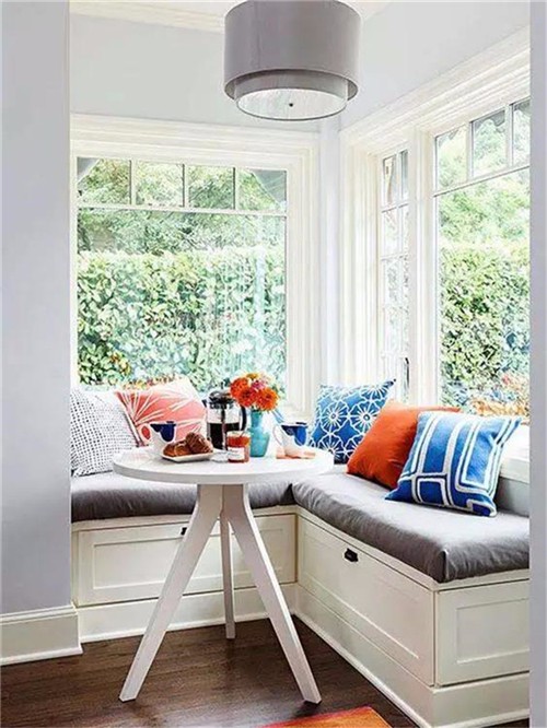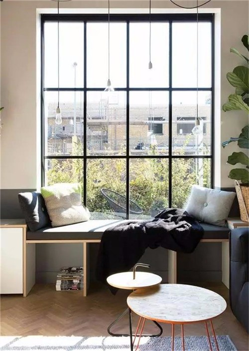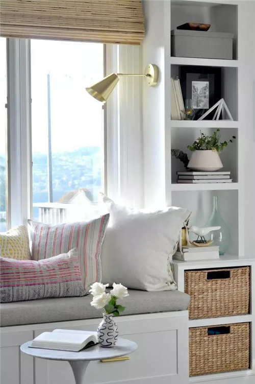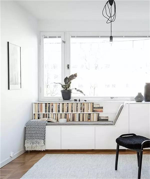 如果不是落地窗,可以在窗下设计一个收纳坐凳,搭配软软的坐垫,几个舒适的抱枕,一个小小的休息角就完成了。冬日里三五好友相聚,则可以一边晒太阳看风景,一边闲聊或者博弈,繁重的生活就显得难得轻松。