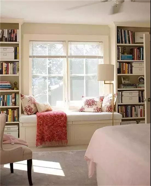 在窗前设计一个小小书柜或者书架,留给阅读与思考。背靠风景阅读,只需沿着窗台设计与之契合一体的矮榻,或根据户型结构,在窗台的两侧或矮榻下方打制书柜、装上阅读灯。凭窗远望也好,品茗阅读更妙,读书一角自在闲适。